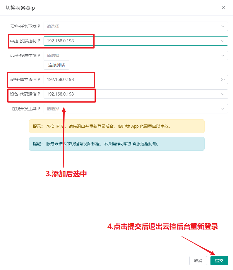 当后台服务器切换 IP 后,手机端 云控APP 需手动断开后重新连接,或重启 APP 以生效。